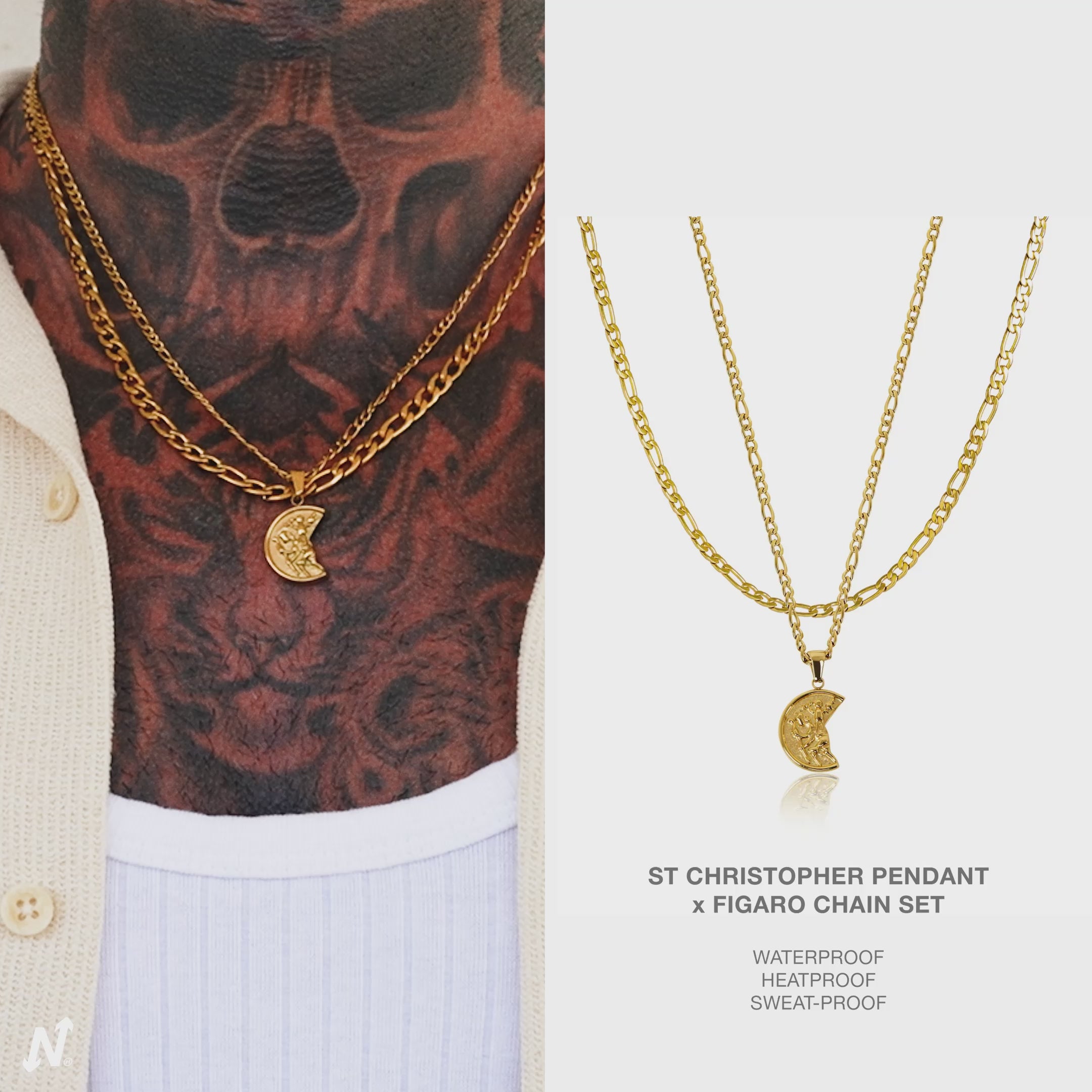 St Christopher Pendant x Figaro Chain Full Set - Gold